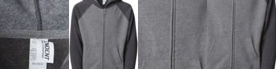 - Raw-edge seams on raglan shoulders, side gusset panels, pocket and waistband