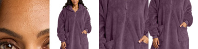 This two-sided brushed fleece poncho is simply fluffy and fun. Perfect for lounging, it offers a warm retreat any time of year. 7.9-ounce, 100% polyester fleece 1/2-zip popover style Generous hood Rib knit cuffs Patch pockets Drop tail hem Oversized fit
