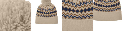 100% acrylic Double layered for warmth Eye-catching knit pattern Five darts at crown for shaping Adjustable 3-inch cuff